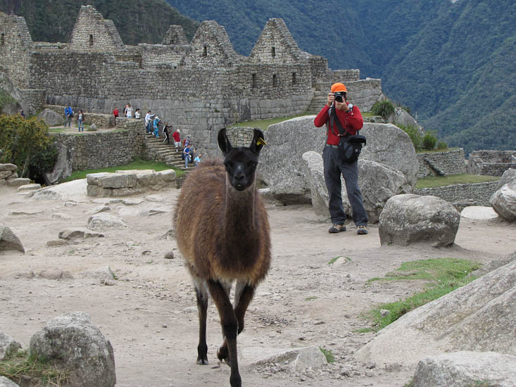 The train - the vistadome - was quite nice, with glass panels in the roof for a better view of the scenery. We sat opposite a Philippino man who lives in Manly, and an American from Salt Lake City. We had a pleasant 3 hour trip (with breakfast) into Aqua Calientes, the tourist town in the valley below the Machu Picchu ruins. The town was a surprise, much smaller than we had expected from the map in the guide book, with only one street - the other streets shown in the book were only alleyways. Hotels/hostels/restaurants and souvenir shops everywhere. We found a hotel overlooking the river, and the main street, got some lunch and then it was time for a bus ride up to the ruins and our first look at this famous site.