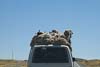The answer is astoundingly simple but I would not have thought of it. You tie 4 feet of each animal together so they cannot move and then stack all of them in the vehicle roof rack. Of course the people go inside. We did not get a photo of llamas in this position but you can see the photo of the sheep being so transported.