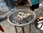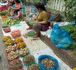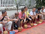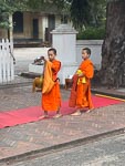 We were on our way at 5:30 this morning to watch the walking monks. There are a number of Buddhist monestaries in LB and every morning the monks from these monestaries walk along the local streets collecting food. The locals, and now tourists also, sit on the side of the streets and place food (usually boiled rice) into the begging bowls of each monk that passes by. The monks periodically unload their collection into large communal bowls and then continue their walking. Nina noticed that in a few places the monks actually also distributed food to some local people from their begging bowls. We assumed these receiving locals are identifiable as poor or in some other way deserving.