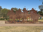Journal entry for Sunday 13th Jul, 2025 (day 59, miles 336)Before hitting the road this morning I walked the few meters to Dirrenbandi's town park and photographed the metal relief-statue of a charge by Australia horse soldiers in WWI, and some coloured poles (which I think have some aboriginal significance). After that I had coffee at the town bakery which is run by a Russian family.