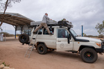 ...click/tap to read the full postWhile packing up this morning I noticed that the solar panel was coming adrift from its mounting. The panel had been afixed to some aluminum L sections on the roof with pop-rivets and all the vibration from the rough roads we have travelled have worn the heads off the rivets. As a result one entire side of the panel was no longer fastened to the L section. A few kilometers after leaving Wooramel we stopped at Wooramel Roadhouse and borrowed an electric drill and got some self-tapping screws to re-fasten the panel. That first photo is yours-truly demostrating his balancing skills while installing the new self-tappers.