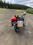 ...click/tap to read the full postI dithered about in Whitehorse a bit this morning before getting underway. I had to buy one of those red plastic fuel containers and then figure out how to attach it to the bike. I had expected to get a 2 gallon container but of course I should have realized all containers here would be metric so the choice was 5 liters (1.25 gals) or 10 liters (2.5 gals). After way too much deliberation I went with the 10 liter variety. Strapping it to the bike required a set of 4 lime green tie-down straps 3 of which were surplus to requirements; thus my load of unnecessary items is increased.