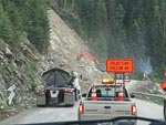 ...click/tap to read the full postSome distance east of last nights our camp we came upon a couple of work crews fixing the road. The first of these was a small affair where a side creek had washed away the pavement. But the second was a major job. It seemed like an entire hillside had collapsed and slid over the road and there was a large crew of workmen, heavy machinery, and gravel trucks clearing the road and rebuilding the hillside. We had to wait a while at the western side of this work area for a pilot car to lead us through the workings.