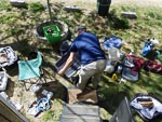 ...click/tap to read the full postWell, we got off to a bad start this morning. Out first chore of the morning was emptying our waste water tanks at the campground sani-dump. Unfortunately I failed to notice a short concrete wall beside the dump area and as I pulled out of the dump the right hand side of the truck collided with that wall and completely destroyed the camper stairs and almost completely removed the storage box behind the stairs. That left the vehicle in an un-drivable condition so we spent the next 2-3 hours removing the damaged step assembly from the vehicle and finding a way to carry the damaged storage box on the rear carrier beside the spare tire. The real bad news of this event is that there is some significant damage to the actual camper body in the vicinity of the stair well and that will require some professional repair at some point in the nearish future. In the interim I will seal it with silicon and duct-tape in the hope of preventing water entry.