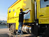 ...click/tap to read the full postYou might have noticed, in previous photos of the truck, the world map on the right hand side of the camper box. We had this put on during the construction so that we could discuss with people where we were from, going etc. At the time we chose to have the map land masses "cut out" so that the camper yellow showed through and also to color the land masses a muted grey. As a result some of the smaller land masses got deleted (for example NewFoundland and PEI) and country boundaries were hard to see. Nina was unhappy with this so a new map was called for, and today it was installed. As you will see in future photos of the truck the new map is a traditional rectangular multi-colored map of the world.