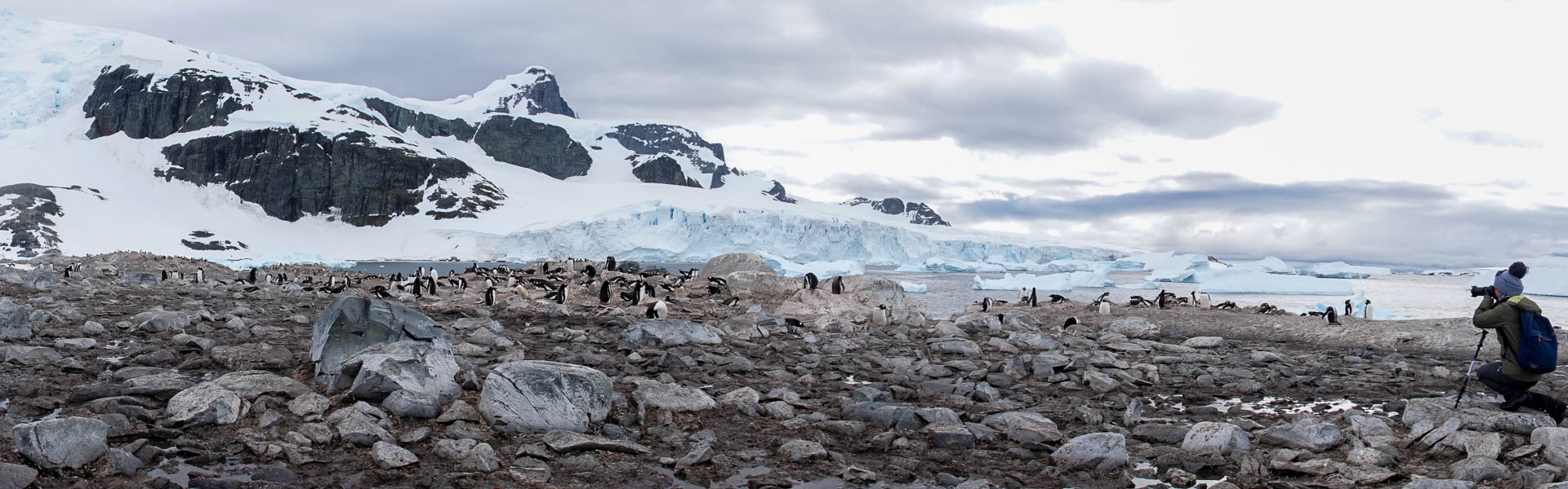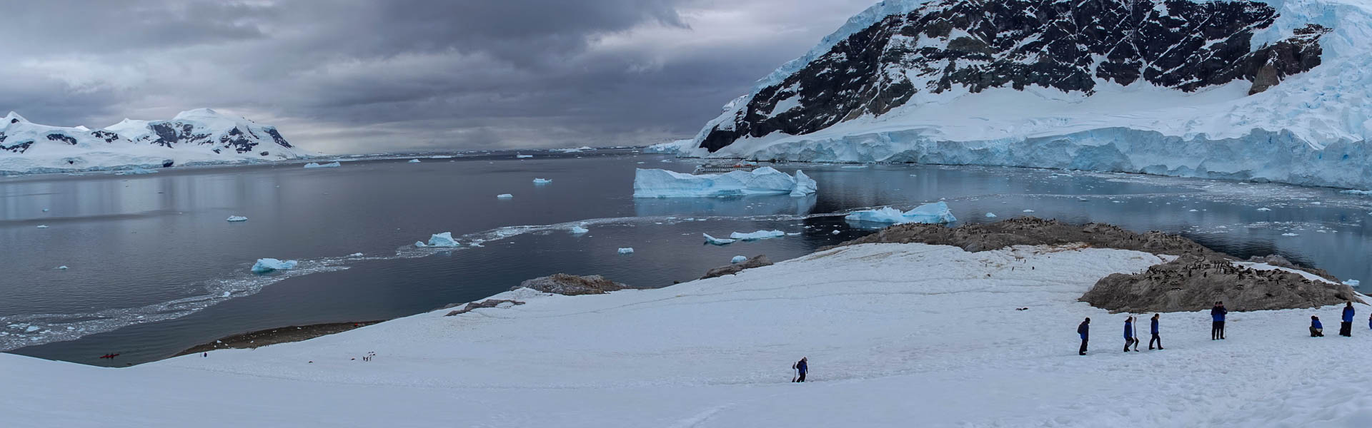 This morning we made a landing at Neko Harbor a small beach in Andvord Bay on the west side of the Antarctic Continent. The harbor is named after a Scottish Whaling ship which operated in the area between 1911 and 1924. We landed on the small beach south of a huge glacier, observed the Gentoo penguin colonies that occupy the small number of rock out croppings, and walked up a large snow slope on the southern side of the harbor. For the more adventurous of the guests this snow slope offered the opportinty to do a bit of bum-sliding down the steep face of the snow ridge. Nina, my guardian angle reminded me that this activity was probably not for me as I am still only 6 weeks into recovery from neck surgery.