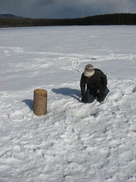 In the parking lot and out on the lake there was evidence that some fishermen had been at play during the day. There were lots of fresh boot tracks on the lake and the fishing holes had only a thin layer of ice on top of the water.