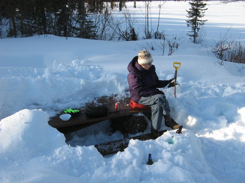 In order to have our evening cocktails on a picnic table I had to break out the shovel, and clear the snow off the table, we had selected.