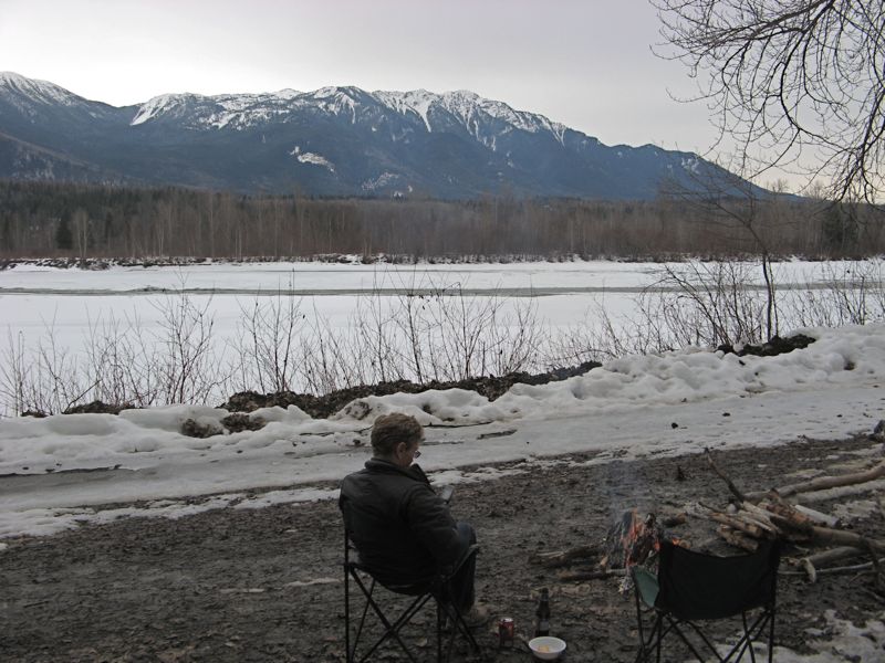 At the town of Hazelton we turned off towards the the campground we had identified for the night, Keynton Lake. From Hazelton we turned north to Old Hazelton, which hosts the KSAN, a museum of first nation buildings which we had explored on previous visits. Continuing past Old Hazelton we turned onto the Kispiox valley road but eventually discovered a closed gate and a road closed sign which prevented us from getting to our intended campsite. So we decided to camp on the road just short of the closed gate. Although it probably does not sound much the camping spot we finished up with was picturesque, as we were right beside the Skeena river with a great view of the Rocher Deboule mountains.
