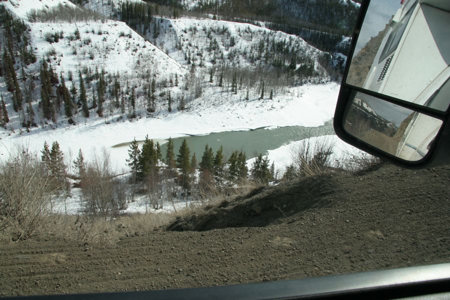 A few miles further on we traveled along a rock peninsular about 100 yards wide with the Stikine river about 400 feet below on the left and the Tahltan river 400 feet below on the right. At the end of the peninsular the road entered another series of switchbacks down to the Tahltan river bridge and a first nation summer fishing village. The climb out of this valley was, if anything, even more spectacular than the descent. Just to make it more interesting we were confronted with an oncoming pickup truck on one of the narrow sections of the ascent.