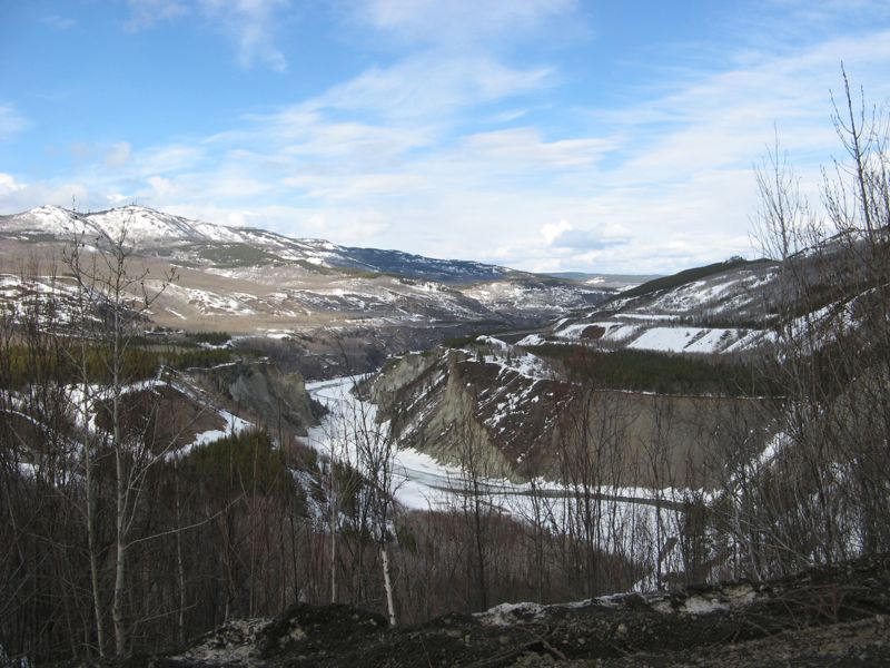 But the typical bit ended abruptly with a sign that said - beware road has steep grades of up to 20%. And sure enough not long after we found ourselves creeping down a series of steep (18% grade the sign said) gravel switch backs to a bridge over the Tuya River. Not long after we were presented with another series of switch backs this time the grade was 20% down into the valley of the Stikine River.