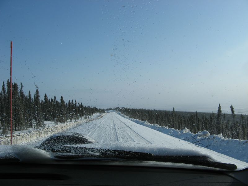 After the Peel the conditions changed. The road is at a lower altitude traveling through the valley of the MacKenzie river, temperatures are higher - 10°F, the land is flatter, and there is a forest of stunted spruce trees on each side of the road. There was a lot more traffic much of it large trucks carrying earth for some reason. The heavier traffic seems to have caused the road to warm up as it is now muddy. After about 60 kms the truck traffic stopped and the road was again frozen with periodic snow drifts; but the land is still flat and the spruce forest continued.