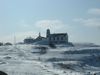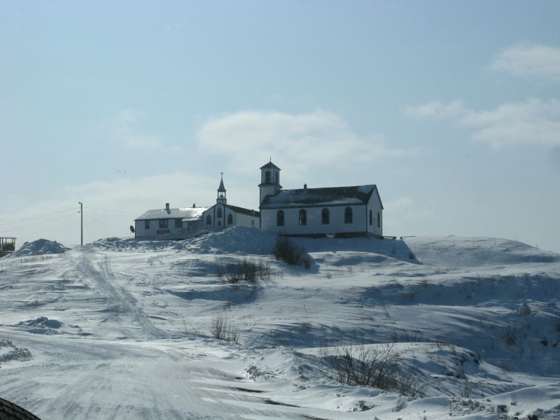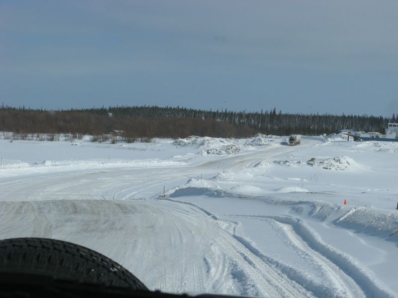 The crossing of the MacKenzie river, our second ice bridge, was something to see. The river was wide, maybe a kilometer, and crossing it took a few minutes, at least, so that we could not help but notice it and experience being in the middle of a river. To add to this right in the middle, there was an intersection and a side road went to a local village. Nina of course insisted that we take the detour to the village to look at the church. The road across the river really was ice, with a bit of snow cover. Hard to walk on but it did not seem too difficult to drive.