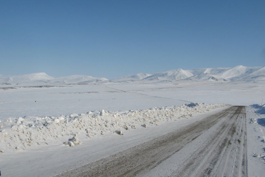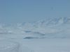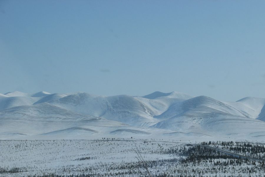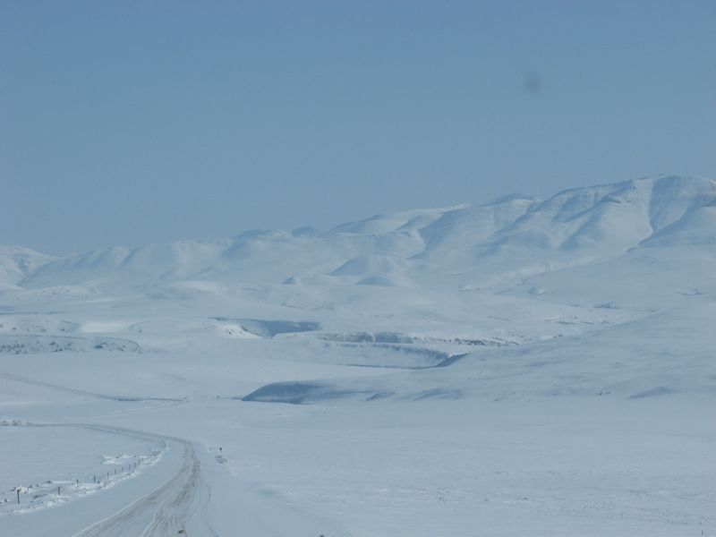 Once we got underway the day turned into one of those memorable highlights that you hope you get a few of on any trip. From Eagle Lodge the road climbed onto the ridge tops of a series of rounded hills and traveled above the tree line. The temperature was 5-6°F so the road was hard with occasional drifts of fresh snow covering the road. The views were stunning. I felt like we could see forever, and in every direction there were huge round topped mountains completely white with fresh snow. Eventually the road descended into a series of wide valleys, still above the tree line and still with stunning views.