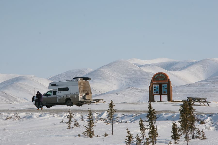 The first milestone of the day was crossing the Arctic Circle. There is a monument and a rest area to mark the spot; it was 5°F as we pulled in beside the monument to take a few photos.