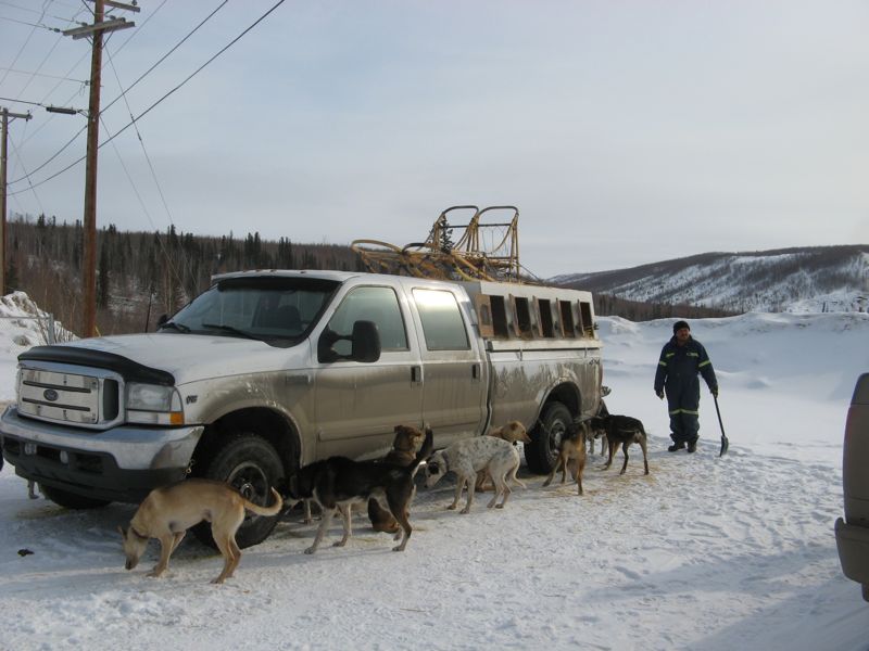 On the way out of town we spotted a pickup truck with a set of kennels in the back for carrying a team of sled dogs, the dogs were out of their kennels and tied around the truck so we stopped to take a photo.