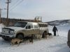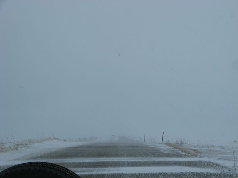 At the Peel River crossing a roadside sign said the road was closed but as we approached the ice bridge we did not see any closed signs, and other vehicles were crossing so we proceeded. South of the Peel the road climbed out of the MacKenzie river valley onto ridge tops. At this higher elevation blowing snow and low cloud made for poor visibility from time to time and there were a number of occasions that we were thankful for the row of snow poles beside the road. About 100kms from Eagle Lodge we passed by a road maintenance depot and another road closed sign with flashing lights. Now we understood. The previous sign was not signaling the closure of the ice bridge at the Peel river but the closure of the road because of weather. However, we had been passing other vehicles from time to time so decided to proceed. The light snow fall and strong wind continued giving rise to periodic poor visibility but did not impede our progress, just increased the caution in our driving. It was comforting to have 4-wheel drive.