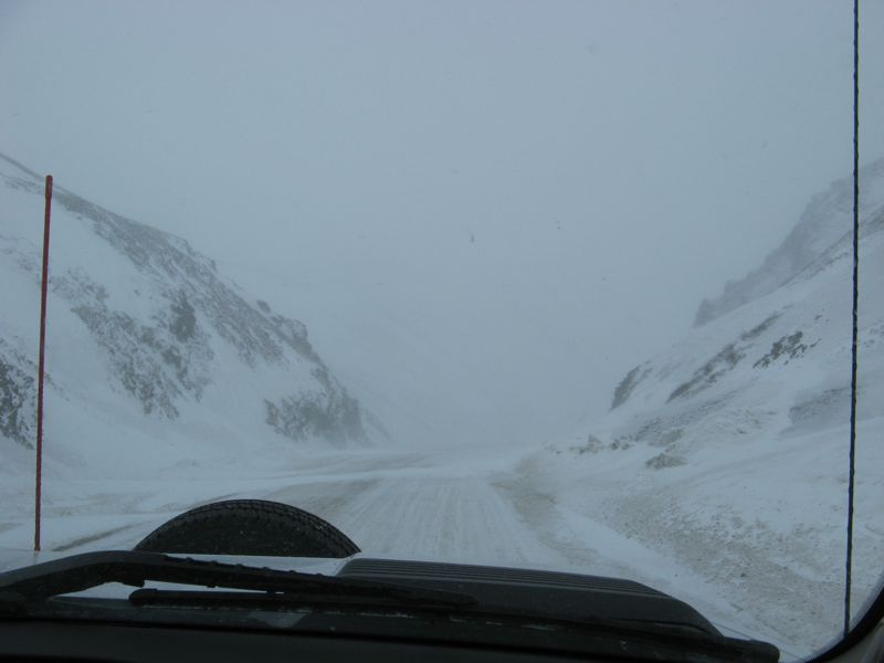 Back on the Dempster heading south it was snowing lightly, and there was a strong wind blowing snow across the road and leaving small piles of snow in the pot holes. On the southern side of the MacKenzie river crossing we stopped for lunch; it was still snowing with a strong wind. Again we noticed a number of large trucks carrying gravel in the 40 km stretch north of the Peel river.