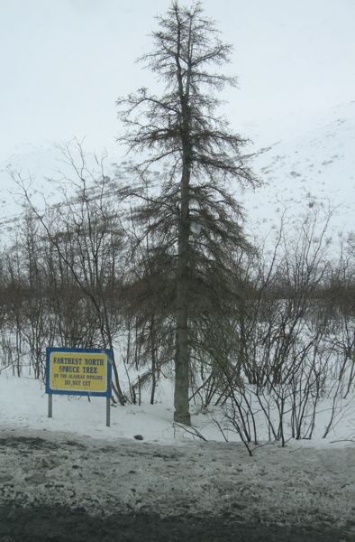 As we approached the last parking area before the climb to Atigun Pass we decided to stop for the night and leave our attempt on Atigun until tomorrow when we were confident weather conditions would be better. As it turned out this parking lot was only a few hundred feet from what the guide book described as the last spruce tree heading north , meaning of course that from this point north we were to be out of the tree line and there would be no more trees. But we discovered that: