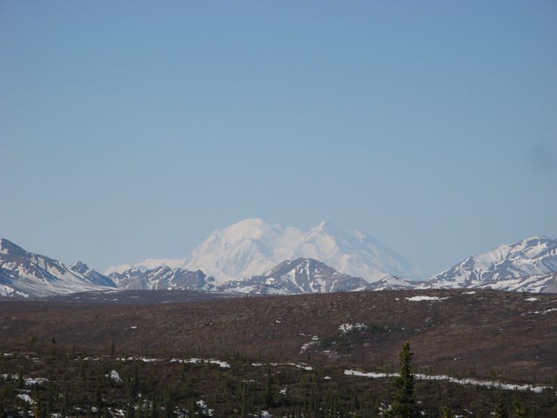 Within 10 miles we had our first views of Mt McKinley, a huge snow covered mass in the distance with not a cloud anywhere to obstruct our view.