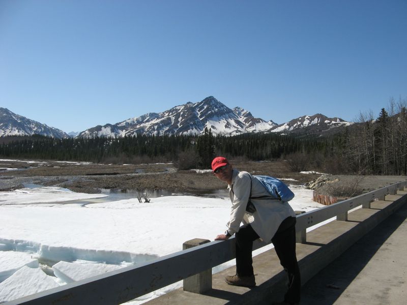 After dinner once again we walked along foot trails to the bridge over the Nenana River to see what had happened to the ice pack during the day. The river had changed a lot during the 24 hours. The ice pack was gone, the river had reverted to a single channel leaving a large area of ice chunks up to 4 feet thick high and dry in the abandoned channel.