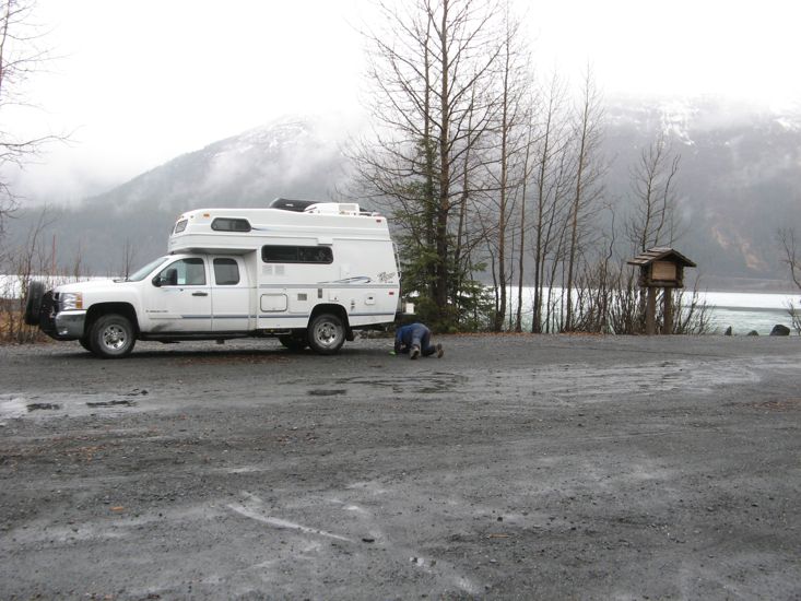 Seventeen miles out of Seward we pulled into a State camping ground to see if it would be suitable for the night. After a tour around the available sites I noticed air leaking from one of the tires. I could not believe it. After all those miles on gravel roads where we had been warned about flat tires we get a flat driving around a campground. It took only about 30 minutes to put the spare tire on and then we were on our way to Seward looking for a place to repair a puncture.