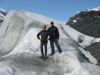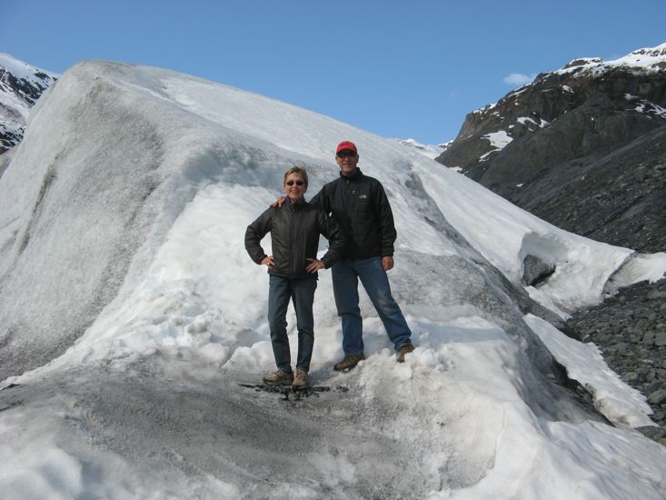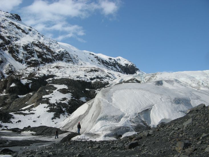 After picking up our repaired tire we headed up a side road to Exit Glacier about 8 miles from the Seward highway. The road goes to a parking lot about a mile from the toe of the glacier. We spent a pleasant hour walking across the river bed to the glacier, and climbed on it only enough to get a photograph. It has contracted a lot over the last 150 years, this was demonstrated by a series of signs showing where the toe was at various dates since 1830.