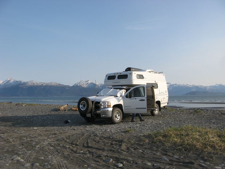 We chose a campsite right on the pebble beach and parked with the house window looking straight down the inlet. If this was a hotel in the lower 48 we would be paying $400 a night, as it was, the camp site cost us $5 (lets not mention the price of the motor home).