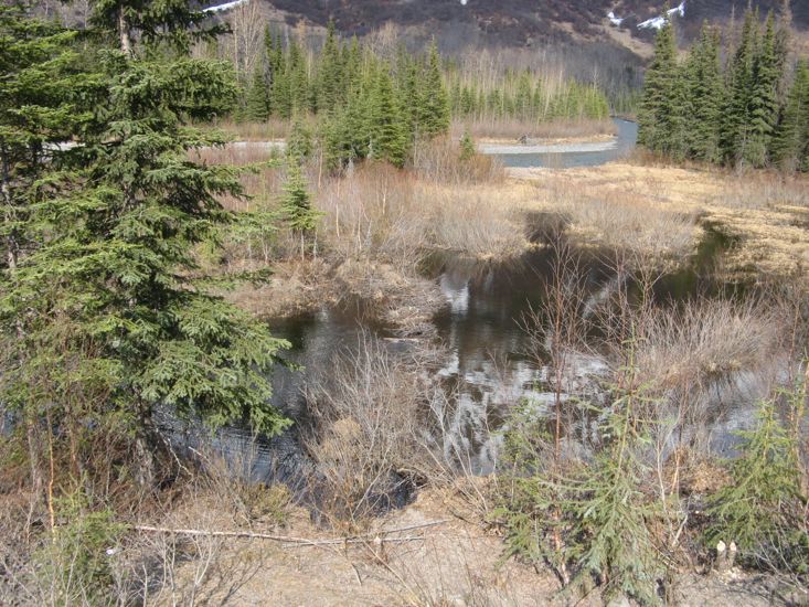 On the Seward Highway heading towards Anchorage we decided that the Six Mile Bike and Walking Trail was a good opportunity to get some exercise so we spent an hour walking this well made trail. In the process we got an unexpected treat when we discovered a pond with several beaver dams and many trees stumps that clearly showed beaver tooth marks. It's the best example of beaver ponds and tree felling that Nina and I have seen.