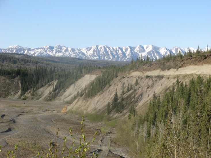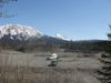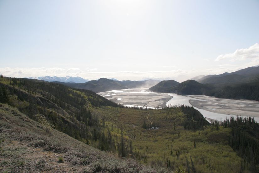 From our camp in the bed of the Copper River the McCarthy road climbed along the face of the valley wall over recent small rock falls to a ridge between the Copper River and the Chitina River. From this vantage point we could see east and south into the Chitina where the river meandered through a very wide valley. In the distance the valley was full of dust haze whipped up by the wind.