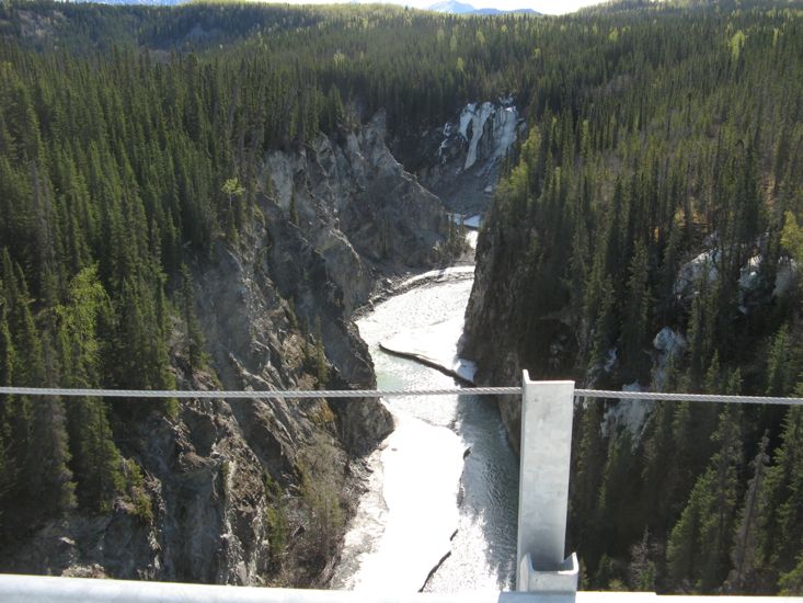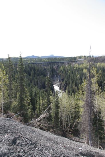 At mile 17 the bridge over the Kuskulana River was certainly one of the more notable points on the road. This single lane bridge, originally built in 1910 for the railway, was rehabilitated in 1988. It is 525 feet long and is suspended 238 feet above the swirling waters of the Kuskulana gorge.