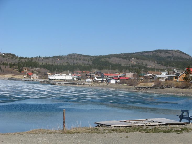 Earlier in our trip we had bypassed Atlin with the thought that we should make that side trip later in the season when, we hoped, more things would be open and the lake might be blue rather than white. So at Jakes Corner, we made the turn and started the 98 km journey to Atlin. The day was clear, blue sky, and bright sun; a perfect day for this scenic road. Interestingly the lake was still partly frozen, with slushy ice covering a good proportion of the lake area.