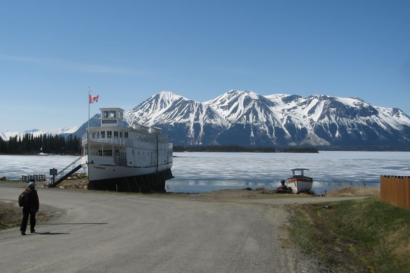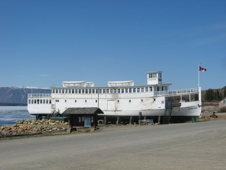 The town of Atlin has a beautiful setting, right on the lake shore, looking across to snow covered mountains. On the lake front in downtown Atlin is an old wooden boat/ship called the Tarahne, which is now out of the water sitting on wooden stands. This craft built in 1917 to haul cargo and passengers on Atlin Lake, was the first propeller driven and gasoline powered craft in the north.
