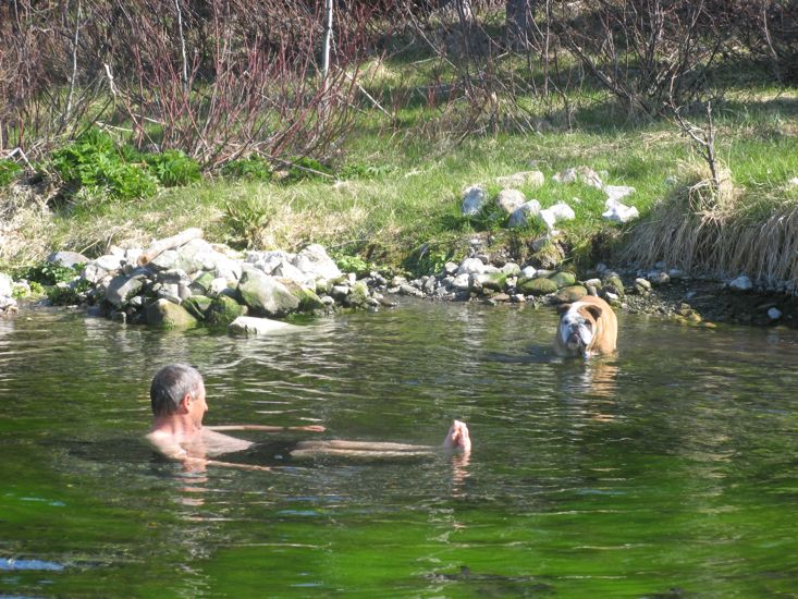 After a short visit in the town we drove out along the Warm Bay road to Palmer Lake where we stopped for lunch. Following lunch we decided to take a walk along the road for some exercise, and in the process discovered a warm spring. The dog in the water with me belongs to some people from Colorado that were also at the spring.
