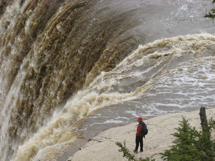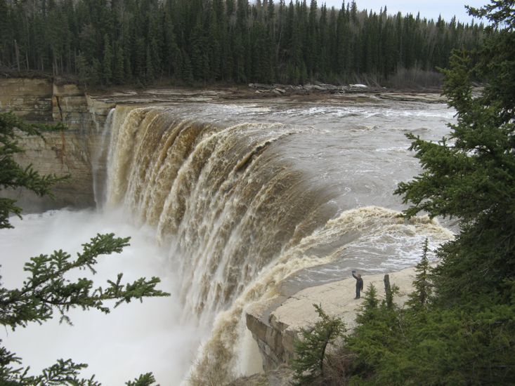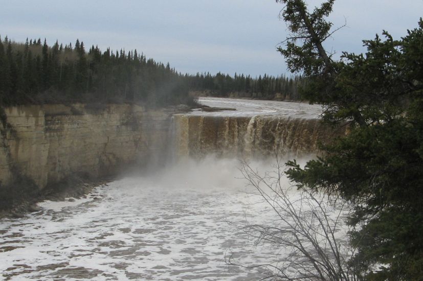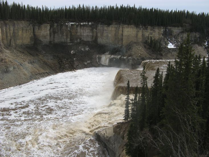 Back on the Mackenzie highway we passed through Twin Falls Provincial Park which is named after Louise Falls and Alexandra Falls both on the Hay River. Alexander Falls at 109 ft is the taller of the two but they are both impressive, more for the volume of water that flows over them than for their height. At Alexander Falls we met a group of three people sightseeing that had arrived, and departed, in a small blue gasoline powered helicopter.