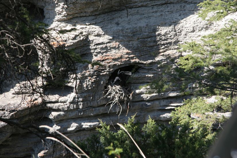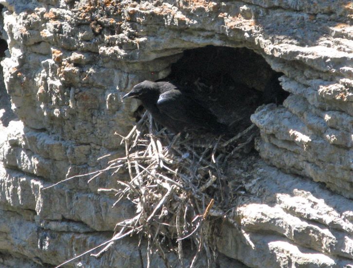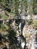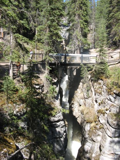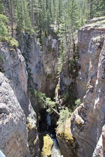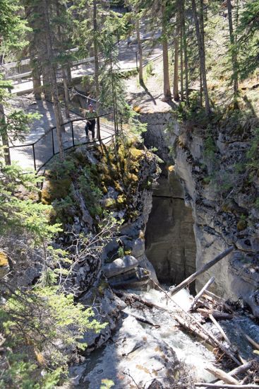 We spent a relaxed hour perusing the shops in downtown Jasper before taking the drive to Maligne Canyon. So named because a missionary priest traveling this way in the late 1800 lost all his possessions in the area and in retaliation cursed the area and declared it evil - maligne. The canyon is a very narrow fissure cut in a bed of limestone by the long term action of the waters of Maligne Creek. At its deepest point the canyon is over 150 feet deep and maybe 10 feet wide. It's very spectacular. While hiking the steep trail that gives access to the canyon we came across a Raven nest in a small hole in the wall of the canyon. We spent a good while being entertained by the antics of the ravens and trying to get a good photograph. It is amazing, and perhaps a little embarrassing how obsessed one can get about taking photos rather than just looking. Just to emphasis this point, Nina just informed me that, already she has over 3000 photos on her laptop taken on this trip.