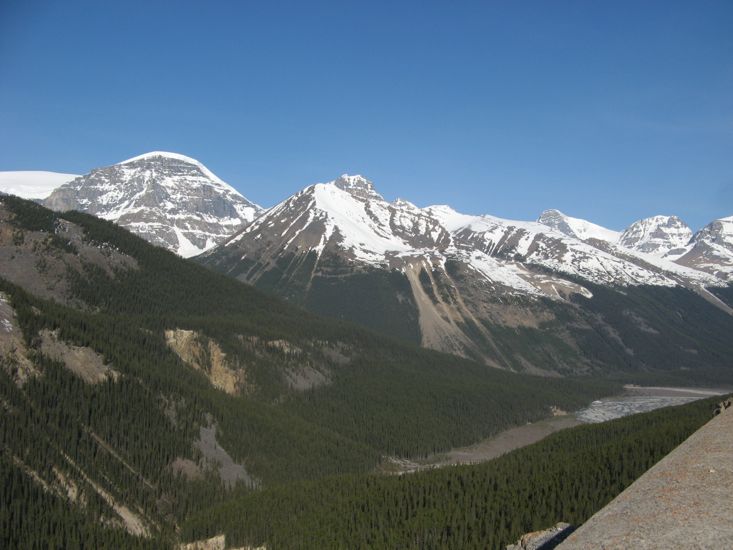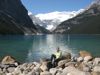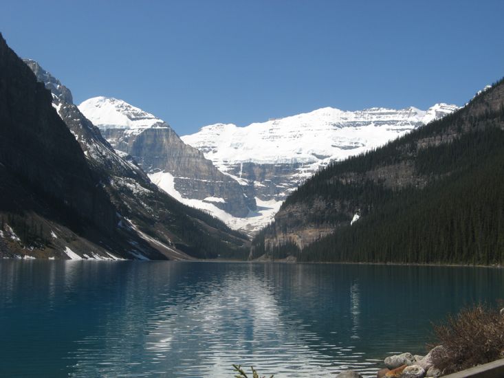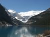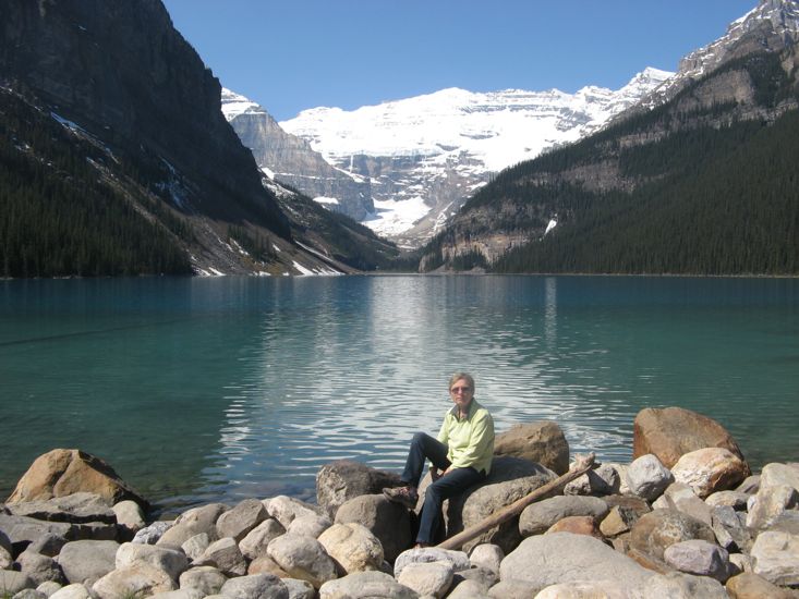 The day started with another clear blue sky and bright sun. The Icefield Hwy lived up to our memory of it with wonderful vistas of mountains, rivers and lakes. South of the Columbia Icefield the air was hazy with thick wood smoke, apparently Parks Canada was undertaking some controlled burning in preparation for the summer. The smoke detracted from the view for much of the southern leg of the highway, but the sky was again clear by the time we got to Lake Louise. The lake and its environs were as beautiful as we remembered.