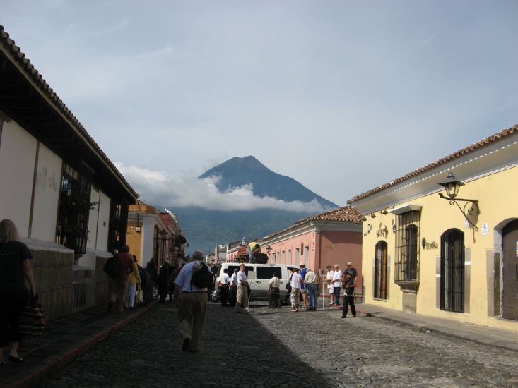 However the city is attractive, with old well preserved or restored buildings everywhere, cobbled streets, and set in a valley between three volcanoes. We had a scrumptious breakfast at one of the better hotels after squeezing Norms large ford SUV into the hotel parking lot. We spent some hours wandering the streets visiting some of the local cathedrals as well as some souvenir shops. The volume of people in the streets increased markedly throughout the morning and by lunch time the place was quite busy. Lots of tourists many of them Spanish speaking with a sprinkling of Americans, Canadians, and English.