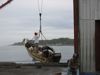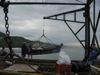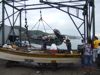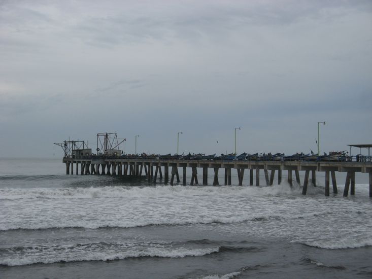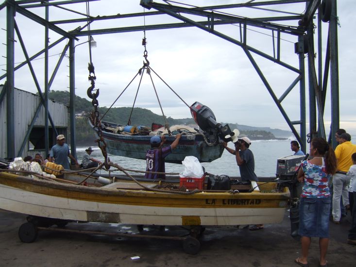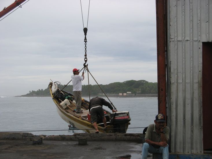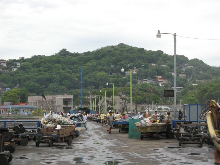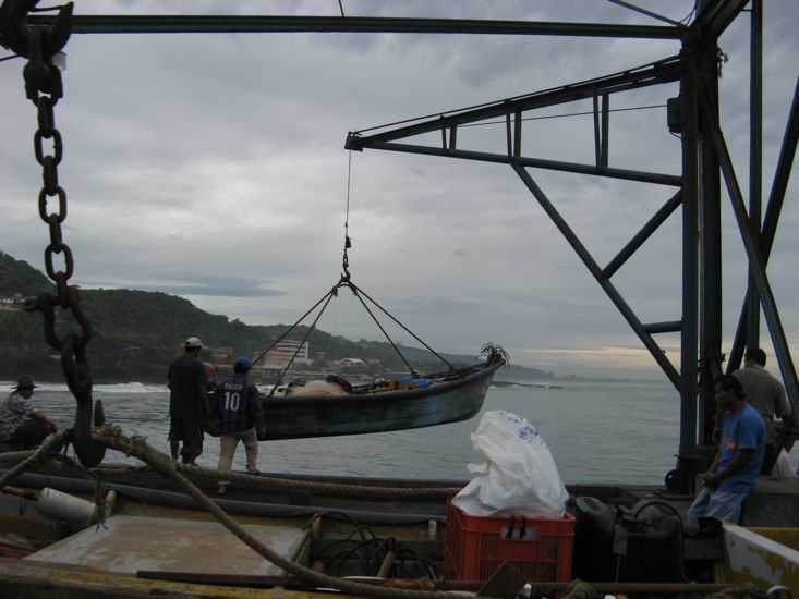 At 7:00 this morning after handing over our laundry to the local washing lady we caught a local bus into the port of La Libertad and went to the fishing wharf or pier to watch the fishermen launch and retrieve their boats. The fishing boats are two man open top dingy type about 4 feet wide and maybe 18 feet long, powered by 40 hp outboards. They store these boats on the wharf on wheeled trollies and when it's time to go fishing the boats on trollies are wheeled to the end of the wharf and lifted into the water by one of two small cranes. The lining up and preparations are quite a spectacle.