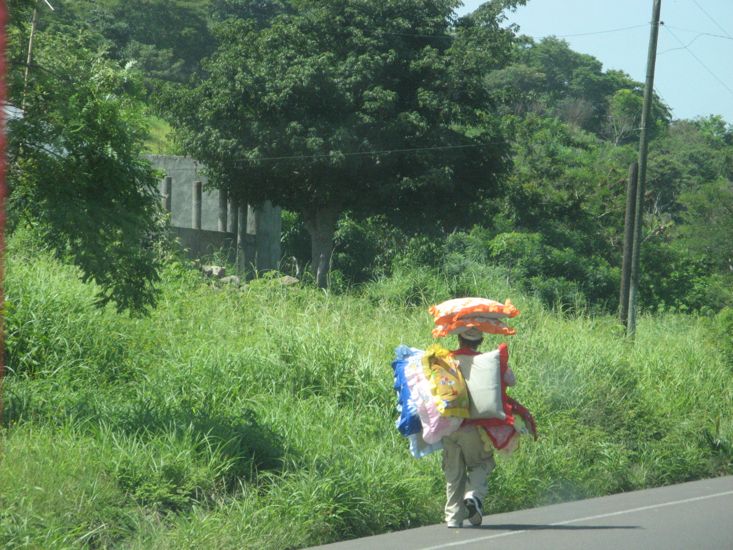 As an aside I should comment on Central American buses. They all seem to be operated by a team of two. The driver and the hawker. The hawkers job as described above is to bring business while the bus is waiting at its starting point, but also to spot people along the route that might be encouraged to get on and to direct the driver to detour if necessary to get those same potential passengers, to collect the fares, to lift any heavy baggage onto the bus, and finally to push the people in so that everyone can fit and also so that the bus can get going quickly.