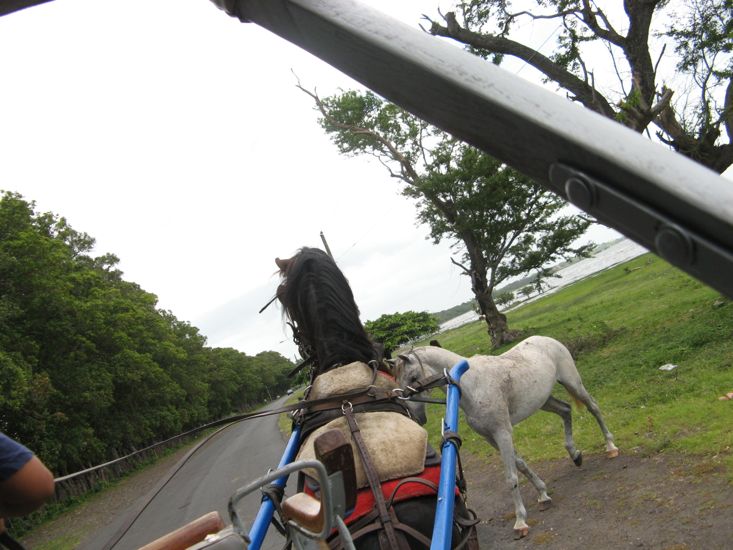 Back at the dock Norm had arranged a horse carriage tour of the streets of Granada for us, so out of the boat and into the carriage. About 100 yards down the road we passed a group of 6 un-tethered horses beside the road. One of these immediately headed our way and came nose to nose with the horse pulling our carriage. This seemed to upset our horse whose reaction was to rear up on its hind legs and back up. All this while still in harness to the carriage. The situation was restored when some passers by in a truck stopped and with the aid of a 6 foot piece of plastic water pipe encouraged the interloping horse to depart. Thereafter the tour went smoothly.
