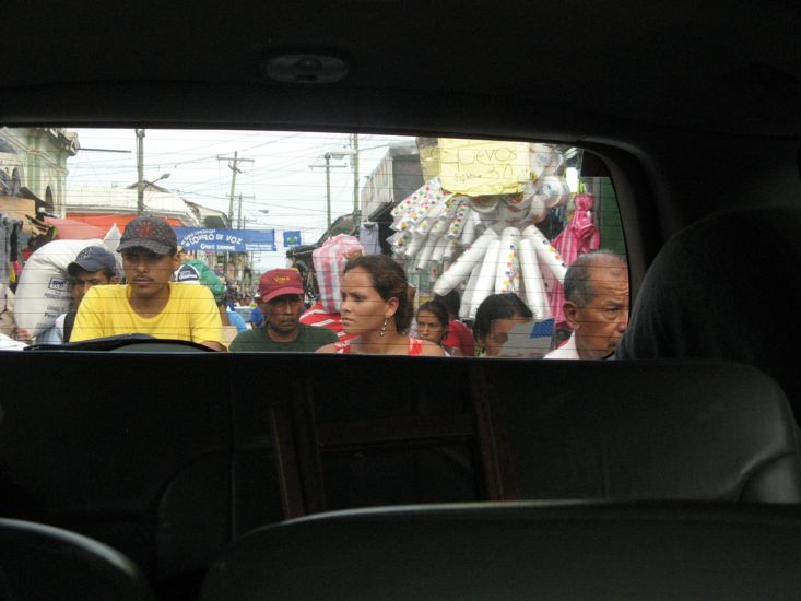 Being in the market gave Nina the opportunity to search for a souvenir she has been talking about for some days - namely an apron. We have seen these aprons every where in Central America. Worn only by women they are lacy affairs with a number of pockets for all kinds of things and come in a variety of colors from white through patterned pastels. We even saw one women carrying a live chicken in the pocket of one of these aprons. Once Norm had traversed the narrow street Nina and I jumped out of his car and headed back into that street. Asking the first lady we saw wearing an apron where we might get one - in sign language of course - we headed off in the direction her waving arms indicated. The mission was successful and Nina is now the proud owner of a light purple Central American Apron