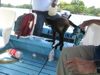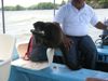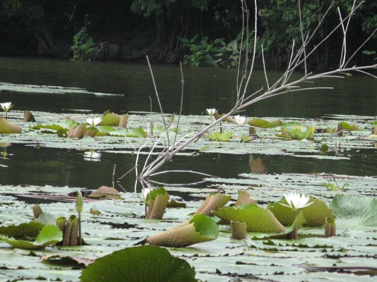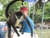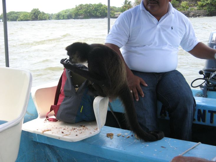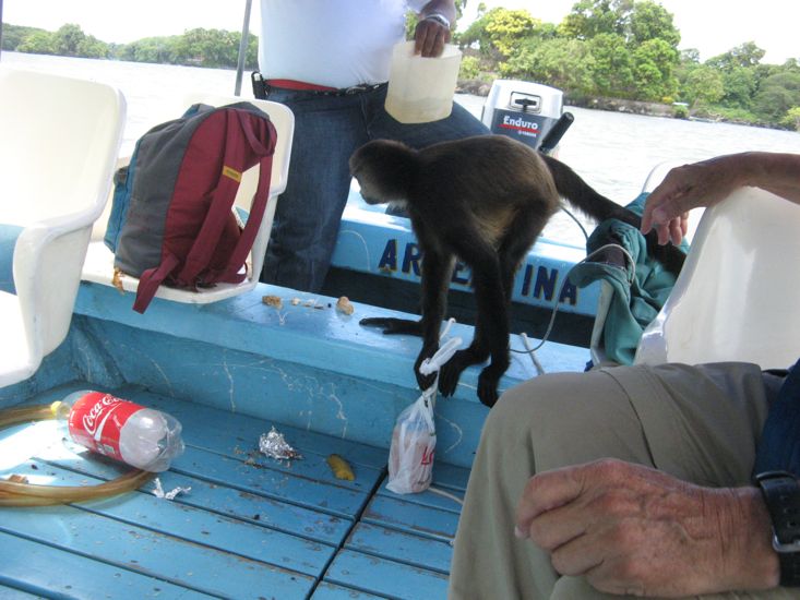 One of the high points of these boat rides was a visit to La isla de la monkeys - you got it the island of the monkeys. About 20 yards across and covered with trees the island seemed to have 6-12 monkeys. After a number of aborted efforts our boat approached the island and to our surprise a monkey boarded our boat. Once on board it headed straight for Nina's pack which I was fortunate enough to rescue. However the boat mans pack was not so lucky. The monkey got into it and into the man's lunch of chicken and rice salad. The monkey - named Lola, even though it was obviously a male - did not at first seem to like the chicken but was quite partial to the rice. We spent the next 20 minutes with Lola as our companion while he ate all of the rice salad. Once the salad was finished he thoroughly searched the bag for more delicacies. Finding no new treats, he sampled the chicken and then reluctantly departed, with some encouragement from a bucket of water thrown by the boat man.