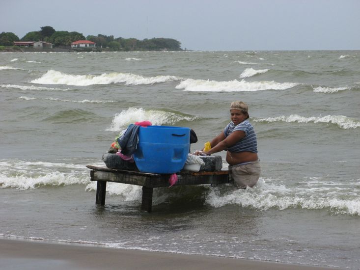 Along the lake front, a few feet out into the lake water we noticed what looked like tables. On further investigation we discovered that they were indeed tables, and they each had two large slabs of flat rock, maybe 2 feet square, on top. Eventually we saw a lady standing at the table, waist deep in water, washing cloths. We later discovered by doing our own washing that actually standing in the lake made it easier to rinse the clothes of soap.