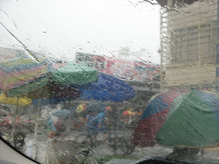 The border procedure followed the usual pattern, Norm walks from one office to another getting stamps and signatures while we wait in or with the vehicles. While around us vehicles of all types come and go. The chaos of this border crossing was spiced up by the arrival of a very heavy tropical rain storm that quickly had the streets under 2+ feet of water. But the activity did not cease, people went about their business and just got wet - though they did try to keep those precious documents dry by putting them under their shirts - even the ladies. A couple of hours and a couple of hundred dollars and we were through and into Panama.