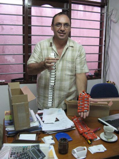 The man in the first photo is Luis, the manager of the Customs agency. He is holding locks for the doors of shipping containers. They are called OneSeal made by a Danish company that he represents in Colombia.