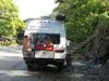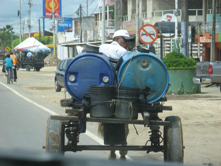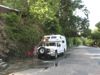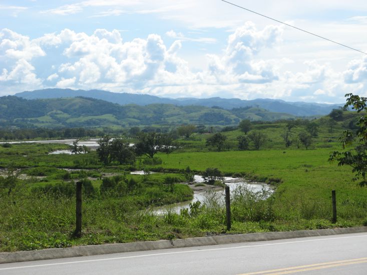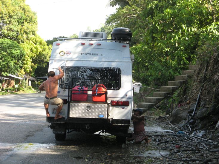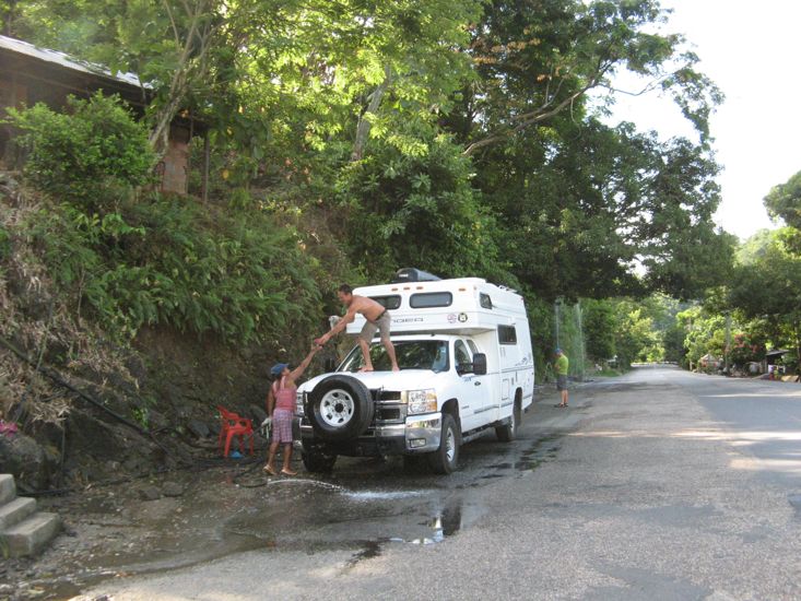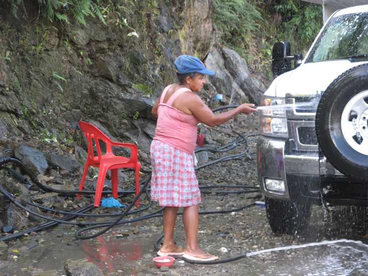 We planned to stop at Taraza today, we had heard about a gas station in Taraza from the questconnect folks. But we got there quite early so drove further down the highway to an area where the locals have turned high pressure natural springs into truck and car washing tools. As we drove through this area water was spouting from the rocks and into the air from hoses. We stopped at one of the places and got the Tiger washed for US$7.50 by a middle aged man and wife team. We can never decide in these kinds of situations whether we are helping them or exploiting. Though in this case the smile on their faces suggested helping.