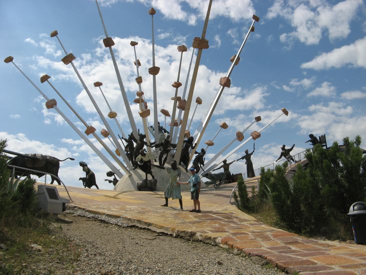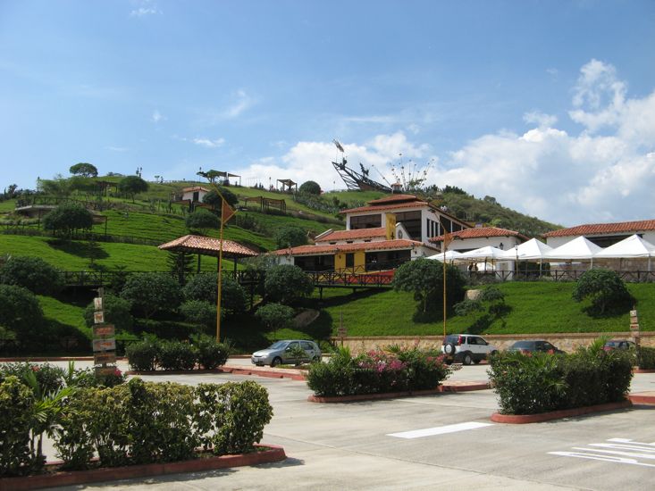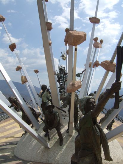 At the top of the grade we came upon Parque Nacional de Chicamocho. A new complex that is more like an adventure center than a national park as we know them. Two zip line rides, synthetic ice rink, dodgem cars on a dirt track, a number of cafes and restaurants, and a cable car that is apparently 6.5 km long and travels down to the river and up the other side of the valley to another tourist complex. However the crowning glory - if I can call it that - of the park is a massive sculpture of a ship with 35 larger than life figures depicting various aspects of an 1871 rebellion and in its center an explosion of rocks.