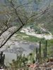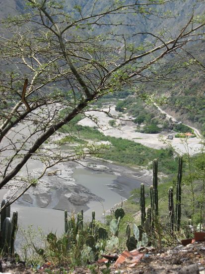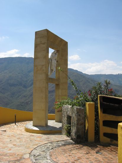 Immediately south of Bucaramunga the road climbed steeply to about 5000 ft and then dropped down into the bottom, and start of Chicamocha Canyon. The canyon was a surprise as there was a complete change in vegetation from lush tropical plants to very dry conditions, almost desert, with various types of cactus everywhere and it was hot with temps in the high 90°F. The canyon was very narrow, and the road was descending whereas we had expected to be climbing. But eventually the valley broadened out and the road started to climb, and climb and climb. It was spectacular, with many switch backs as it climbed out of the valley. Along the way we passed a fascinating Madonna monument (the mother of Jesus, not the music star), that seemed to span both the traditional and techno-modern very well. For the traditionalists there were shelves on which to burn candles as offerings, for the modernists, there was a place to lay a car head lamp next to a statue of the Madonna; yep - you got it - head lamps. Look in the photos.