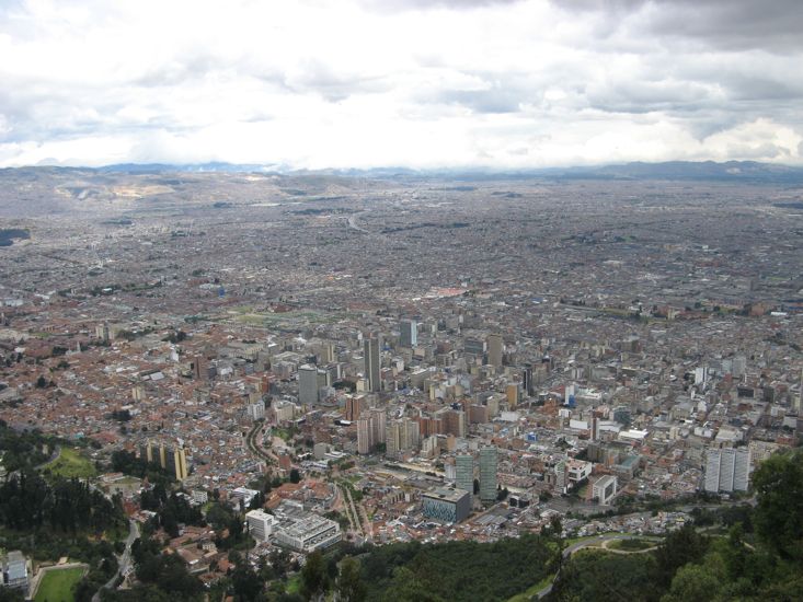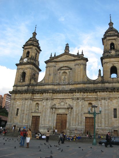 Our first stop was to take the cable car to the top of Monserrate, a mountain east of the center that affords a wonderful view of the entire metropolitan area, It also affords people like us who basically live at sea level an opportunity to experience the effects of altitude as the summit of Monserrate is at about 10,000 ft and there are some stairs to climb once one gets out of the cable car. From the top the general shape of Bogota is visible. The entire city complex sits on a very flat plain surrounded on all sides by ridges. Apparently the area was once a lake bed. The oldest part of the city, and the part that still contains much of the government, is snug up against the ridges on the east side of the plain. As the city has grown is has expanded north and south into the hills but mostly to the west. It has not yet filled the entire plain but seems well on its way to doing so. It's a big city, current population is something like 8 million. The cable car passes over a forest of the most enormous eucalyptus trees. I am still puzzled by the abundance of eucalyptus trees in Colombia, I thought (maybe incorrectly) that such trees were natives of Australia. But our hosts say they are also native to Colombia.